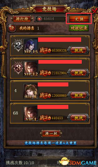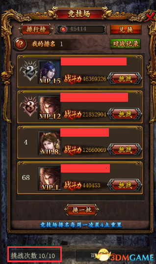 1、每天有10次免费PK机会,可花费元宝购买额外的次数;