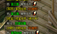 1112玩家通过每日活动可以获得藏宝图,玩家可以使用藏宝图来进行寻宝获得道具,每日最多可使用10次藏宝图。藏宝图分为低级、中级、高级三种,通过神灯系统可以将低级藏宝图合成高级藏宝图,越高级的藏宝图可获得的道具越稀有。日常任务日常任务是玩家获得资源的重要途径,玩家每天可以进行魔怪大剿杀、军团任务、功勋任务和挖宝任务。魔怪大剿杀玩家每日可接取魔怪大剿杀任务。魔怪大剿杀任务共有10环,当做完全部10环任务后还会有额外的十环奖励。军团任务当玩家加入军团后,就可以接取军团任务了。军团任务每日可完成10次。完成军团任务可以获得军团金币和战勋值,战勋值可以用来购买军团内战勋商店的道具。功勋任务玩家每日可完成10次功勋任务,完成任务后可获得经验值和功勋值奖励。功勋值可以用于获得爵位贡献。挖宝任务