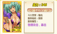 2246暴走萌姬是史上最性感最刺激的H5游戏。爆乳美女激情战斗,热辣卡牌惊爆眼球。收集各类爆乳斗士,带着后宫争霸天下,攀登游戏巅峰。当前版本共有47名角色,将会分篇列出。1.吕布奉先资质:7斗士类型:输出推荐站位:前排推荐属性:物理攻击,暴击技能月下金刚破:对敌方2人造成伤害率180%的提及伤害,并且自己的普通攻击以80%的伤害随机攻击2个目标。 吕布奉先2.董卓仲颖资质:7斗士类型:防御推荐站位:前排图鉴属性:物理防御,吸血技能:苍天血涌:对敌方全体造成伤害率90%的提及伤害,该技能额外增加300点吸血效果。 董卓仲颖3.曹操孟德资质:7斗士类型:防御推荐站位:前排图鉴属性:生命值,追击伤害技能龙爪业火:对当前目标造成伤害率260%的特技伤害,该技能额外增加600点追击伤害。 曹操孟德4.张昭资质: