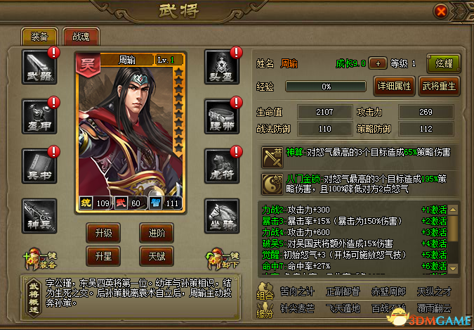 1071游戏中有各式各样的武将,本篇温江将通过不同的划分条件将部分武将列出来,并且会简单列出各个武将的基本属性。武将介绍 武将国家划分及内容介绍如下: 1. 蜀国:关羽、刘备、庞统、张飞、赵云、诸葛亮、徐庶、法正、黄忠、姜维、马超、黄月英、魏延 l 关羽名称:关羽 神将技能:春秋斩武力:110 ★★★★★智力:65 ★★★统帅:105 ★★★★★春秋斩:对单体目标造成475%战法伤害,降低对方4点怒气,并提高自身格挡50%两个回合。l 刘备名称:刘备 神将技能:仁德之治武力:78 ★★★★智力:89 ★★★★统帅:97 ★★★★★仁德之治:对全体目标造成90%策略伤害,并按伤害的20%回复己方全体部队生命值。l 庞统名称:庞统 神将技能:百鸟朝凤武力:58 ★★智力:110 ★★★★★统帅:96 ★★★★★百鸟朝凤:对
