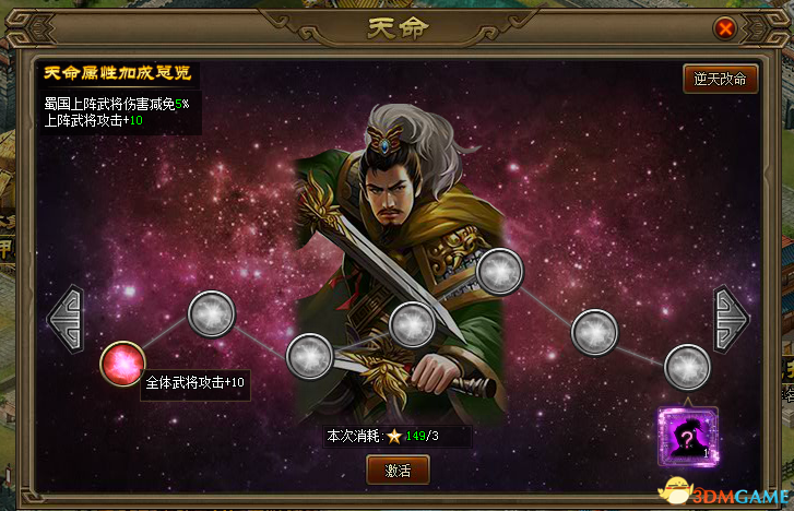 835天命系统通过副本第三章即可开启,天命系统通过消耗星数点亮星星获得属性加成, 天命所点亮的星星每7个为一阶段,具体请看以下规则介绍。天命系统开启条件:通过副本第3章规则介绍: 1. 天命系统通过消耗星数点亮星星获得属性加成,点亮所需消耗的星数可通过副本通关获得。2. 每个星星的点亮都会有各自对应的属性加成,同时会对君主选择的国家上阵武将有额外的伤害减免加成。3. 天命所点亮的星星每7个为一阶段,每点亮7个星星可以获得不同的额外奖励。 4. 君主国家可以通过逆天改命(通关副本17章后开启)按钮进行增加或替换。