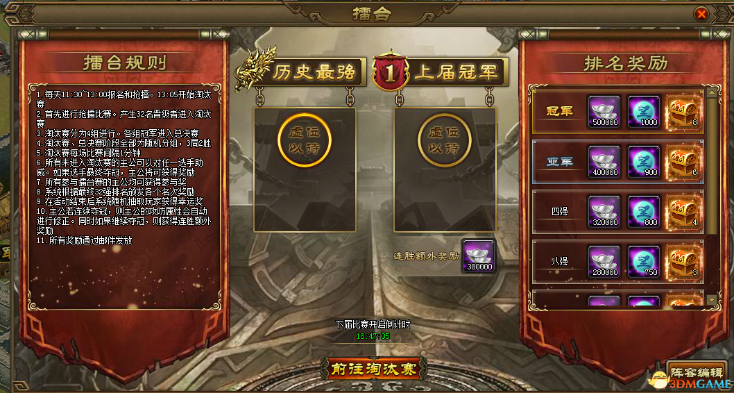 453君主等级48级时开启擂台争霸,若连续夺冠且继续夺冠时会获得额外奖励,具体规则不再赘述,以下有规则介绍。擂台争霸开启条件:君主等级48级主要奖励:银两、声望、星宿石规则介绍: 1. 午间11:30-12:30报名和抢擂,12:35开始淘汰赛;2. 首先进行抢擂比赛,产生32名晋级者进入淘汰赛;3. 淘汰赛分为4组进行,各组冠军进入总决赛;4. 淘汰赛、总决赛阶段均为随机分组,3局2胜;5. 淘汰赛每场比赛间隔1分钟;6. 所有未进入淘汰赛的主公可以对任一选手助威,如果选手夺冠,主公将获得奖励;7. 所有参与擂台赛的主公均可获得参与奖;8. 系统根据最终32强排名颁发各个名次奖励;9. 活动结束后系统随机抽取玩家获得幸运奖;10. 主公若连续夺冠,则主公的攻防属性会自动进行修正。同时如果继续夺冠,则获得连胜额外奖励