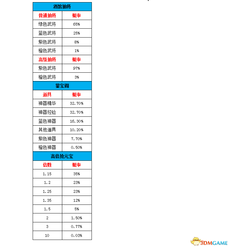 游戏中有多个抽取活动,可以获得道具、武将等。每个活动产出概率是有一定几率而不是100%的,有些较高产出概率是高于50%的,玩家可以通过以下表格提供的信息参与各个活动。 活动产出概率