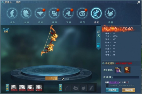145思美人是款东方武侠题材的角色扮演页游。游戏中玩家们可以在这里感受到全新的游戏玩法,带你在这里体验到不一样的游戏乐趣。那么,游戏中玩家们知道侍武系统吗?下面不妨随小编一起来看看吧。一、角色达到65级可开启侍武系统,且获得第一个侍武:“符文” 二、侍武进阶: (1)侍武可以增加角色各项属性;提升侍武的阶数,不但增加角色各项属性,而且能获得酷炫外观。(2)侍武进阶需要消耗:“侍武进阶丹”。该道具可通过侍武进阶副本、挂机杀怪、历练商城等途径获得。每颗侍武进阶丹可提升侍武进阶祝福值,当侍武进阶祝福值达到满值时,侍武将进阶到下一阶。(3)侍武进阶成功后,将获得更炫更酷的外型和更加强大的属性。 三、侍武升级:侍武等级随着玩家的等级提升而提升,侍武等级提升后,将额外增加人物角色的各项属性。四、侍武资质丹:侍武达到4阶后,将可以