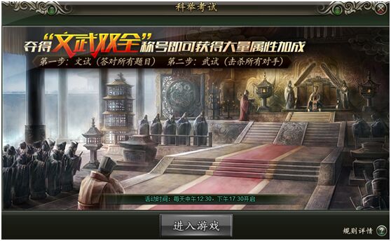 139游戏中拥有很多的特色活动,能获取到丰富的奖励,其中,科举活动也是打天下里一个比较特色的活动。在这里玩家们可以体验到全新的游戏玩法,带你在这里感受到不一样的武侠世界。下面不妨随小编一起来看看吧。 与四方侠士斗智斗勇,争夺文武双全殊荣以及丰厚重奖。活动时间:每天中午12:30和下午17:30等级要求:人物等级60级以上科举分为两部分: 第一部分文试:文试采用积分制,每答对一题都可以获得相应的积分,这里向大家透漏文试部分考的都是历史题。当文试结束后会根据积分排名获得对应的奖励。只有在文试中获得满分的玩家才能有资格进入第二部分武试。 第二部分武试:留在场景中的满分玩家将会强制切换为屠杀模式,被击杀的玩家将被视为淘汰。淘汰掉所有人后,最后一个未被淘汰的玩家将获得科举最高荣誉——文武双全称号