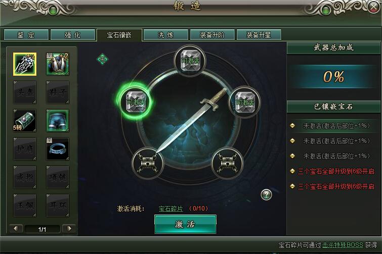 172游戏中玩家们可以在这里体验到各种游戏玩法,带你在这里开启全新的浪漫邂逅之旅。游戏中镶嵌的宝石越多,宝石越高级,装备的加成提升的越多。那么,玩家们对《打天下》宝石镶嵌了解吗?下面一起来看看吧。玩家等级达到107级,通过点击游戏主界面右下方“锻造”界面即可打开宝石镶嵌,每件装备可镶嵌5颗宝石,宝石需要使用宝石碎片进行激活与升阶,上面三个宝石镶嵌槽各消耗10个宝石碎片便可激活,下面二个宝石镶嵌槽需要上面三个宝石全部到达6级就可开启。镶嵌宝石可以给装备加属性哦,激活的宝石越多,宝石等级越高,给装备加的属性就越多。当然做为我们的VIP玩家,在隐藏的VIP商城,可以直接消耗元宝购买宝石碎片哦,镶嵌装备宝石也是提升战力的一个强大系统,提升的战力百分比也是相当的可观。