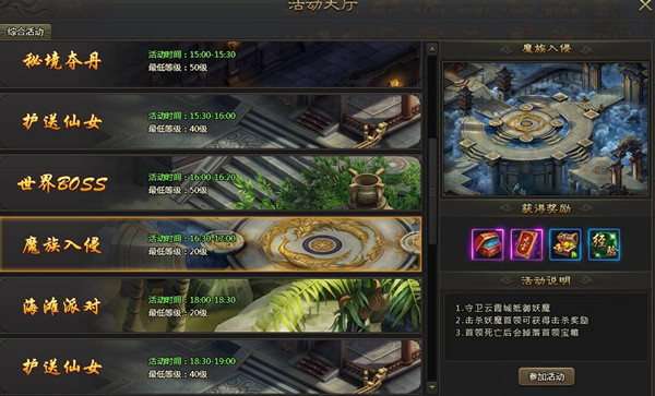 255《九仙图》是款非常好玩的仙侠题材的角色扮演页游。游戏中玩家们可以在这里感受到全新的游戏玩法,带你在这里体验到不一样的游戏乐趣。那么,游戏中魔族入侵怎么玩呢?下面不妨随小编一起来看看吧。魔族入侵活动时间:每天16:30-17:00活动等级:最低等级20级活动玩法1、守卫云霄城抵御妖魔。2、击杀妖魔首领可获得击杀奖励。3、首领死亡后会掉落首领宝箱。【关于九仙图游戏】《九仙图》是全新纵情仙侠类ARPG页游,娟丽的画风笔触、炫酷的人物设定、细腻的特效实感,玩家领略羽化飞升的魅力,开启豪迈的寻仙问道之行。