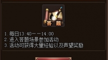 158大话女儿国是款非常好玩的角色扮演页游。游戏中玩家们可以在这里感受到全新的游戏玩法,带你在这里体验到不一样的游戏乐趣。那么,游戏中答题活动怎么玩呢?下面不妨随小编一起来看看吧。《大话女儿国》答题活动 诸葛大名垂宇宙,宗臣遗像肃清高。 三分割据纡筹策,万古云霄一羽毛。人间尚有诸葛,三界之中通达之人可只孔明?你,会不会就是下一个诸葛!答题开始 “答题”为每日定时活动,活动时间为13:40-14:00。活动开启时可通过界面右下角的活动提示面板进入活动界面。或者点击界面右上方的“活动大厅”,在活动大厅直接点击定时活动中的“答题”然后点击“参加活动”,便可进入活动场景。 答题规则 1、题目刷新后可进行答题,选择你认为正确的答案下方的“点击前往此答题区域”,即完成答题。注意题目下方的答题倒计时,每一题的答题时间为20秒。2