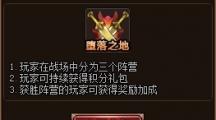 78大话女儿国是款西游题材的角色扮演页游。游戏中玩家们可以在这里感受到全新的游戏玩法,带你在这里开启全新的西游之旅。那么,游戏中堕落之地怎么玩呢?下面不妨随小编一起来看看吧。《大话女儿国》堕落之地 乱世之中,强者为王!在三界之中,有一个名为堕落之地的地方,这里聚集了来自三界各处的英雄们!他们划分为三个阵营,在这片混沌之地肆意斗争!究竟是谁会战到最后呢,且让我们拭目以待!打开活动面板活动开始后,会在界面右下方弹出提示面板,点击即可打开活动面板,也可通过界面右上角“活动大厅→定时活动→堕落之地”打开活动面板。 还可直接点击界面右上方的“战场大厅→跨服战场” 1.点击活动面板的“立即进入”便可进入战场2.活动时间:19:00~19:303.等级要求:40级以上4.活动开始后,可以通过活动面板报名参加,不限次数战场开启进入