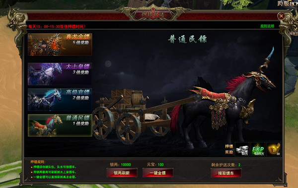 126完美红颜最新更新之后,新加入了镖车玩法,那么这个镖车任务到哪里接,又在哪里完成呢?任务完成后又能得到哪些奖励呢?跟着小编一起来看看吧。 1.镖车任务哪里领 有很多同学不知道要到哪里去接这个镖车任务,其实这个镖车任务就在跨服战场。首先我们点击跨服战场,进入跨服战场地图。然后看右侧的跨服任务,有一个镖车护送的任务,总共是两次。点击一下绿色的字体,就是那个阵营的军需官,点一下就会自动跑过去接任务了,军需官就在出生地边上,一眼就能看到。突变中的红框框里的绿点就是军需官了。需要提一句的是,每天下午3点到3点半是双倍运镖时间,也就是说这个时间段拉车收益是双倍的,没有特殊原因的话推荐在这个时间点拉车。2.镖车任务怎么完成 奖励是多少 镖车任务是要组队做的,这里小编也建议各位组满4个人再出发。找到组队的小伙伴之后,让队长去刷新