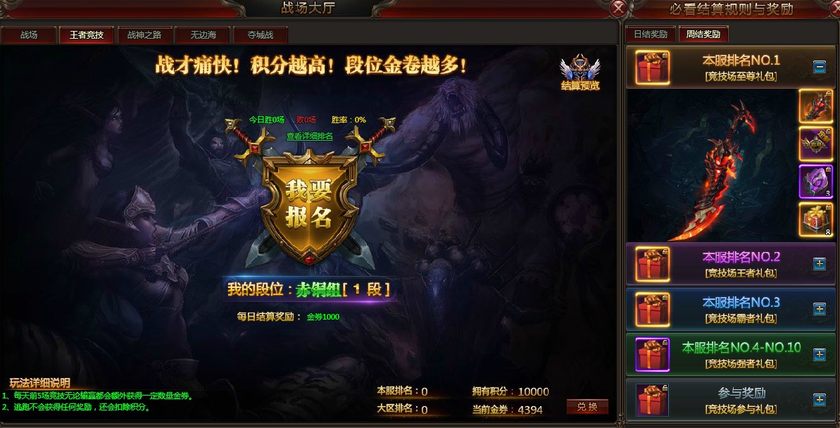 200《龙之女神》拥有各种特色玩法,在这里玩家们可以参与活动获取更多的奖励。其中。王者竞技就是其中之一。那么,玩家们对游戏的王者竞技了解吗?下面不妨与小编一起来看看吧。 【开启条件】 玩家等级≥70级,每天20:30-21:00通过"战场大厅"图标进入参与;【玩法介绍】 1. 玩家通过1v1进行手动竞技,每次比赛结束后,获胜者会获取一定积分,玩家积分越高,则段位更高,每日/每周结算的奖励更丰富;2. 每天前5场竞技无论输赢都会额外获得一定数量金券;3. 逃跑不会获得任何奖励,还会扣除积分。4. 玩家通过竞技场获取的金券可以通过竞技兑换商店兑换坐骑、神兵、翅膀等技能书。
