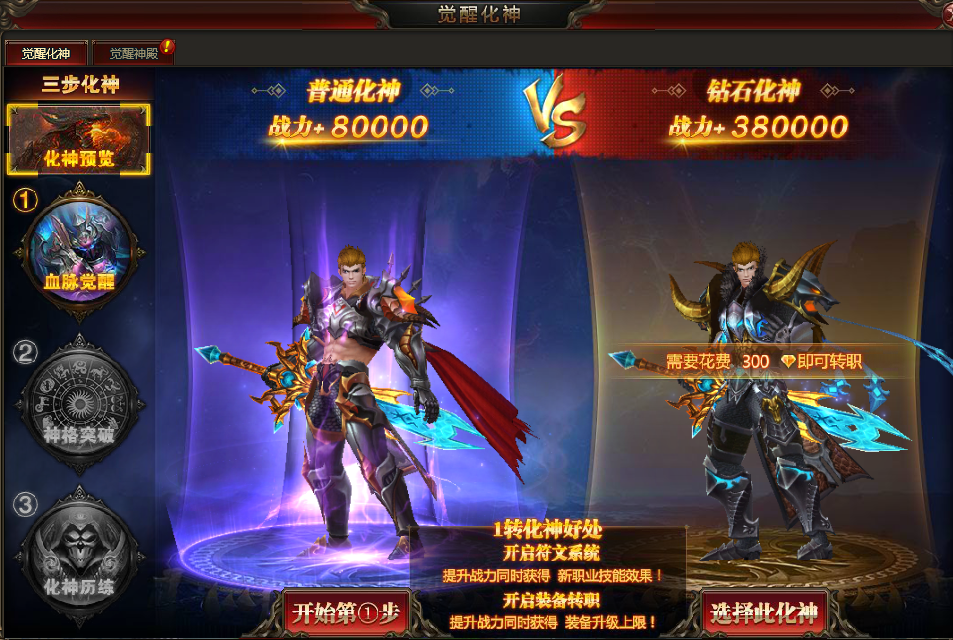 85游戏中玩家们可以在这里体验到全新的游戏玩法,带你在这里感受到不一样的游戏体验。那么,游戏中拥有很多活动玩法,其中,觉醒化神就是其中之一,下面你对觉醒化神了解吗?下面不妨与小编一起来看看吧。 【开启条件】 玩家等级≥120级,可通过"化神觉醒"图标进行觉醒操作。【详细介绍】 1. 觉醒化神有两种:一种为普通化神,普通化神完成后玩家能涨80000战力;另一种为钻石化神,成功后能涨380000战力; 2. 觉醒化神有三步骤:①血脉觉醒:通过参与觉醒神殿或野外挂机获取血脉觉醒石;在"血脉觉醒"界面进行升级命脉,完成血脉觉醒。 ②神格突破: 血脉觉醒后,通过兑换血精进行神格提升,不同的神格会有不同的属性加成,让你的战力高人一等; ③化神历练:完成神格突破后,可参与化神历练,击杀化神副本中BOSS,即能成功化神! 【觉醒化