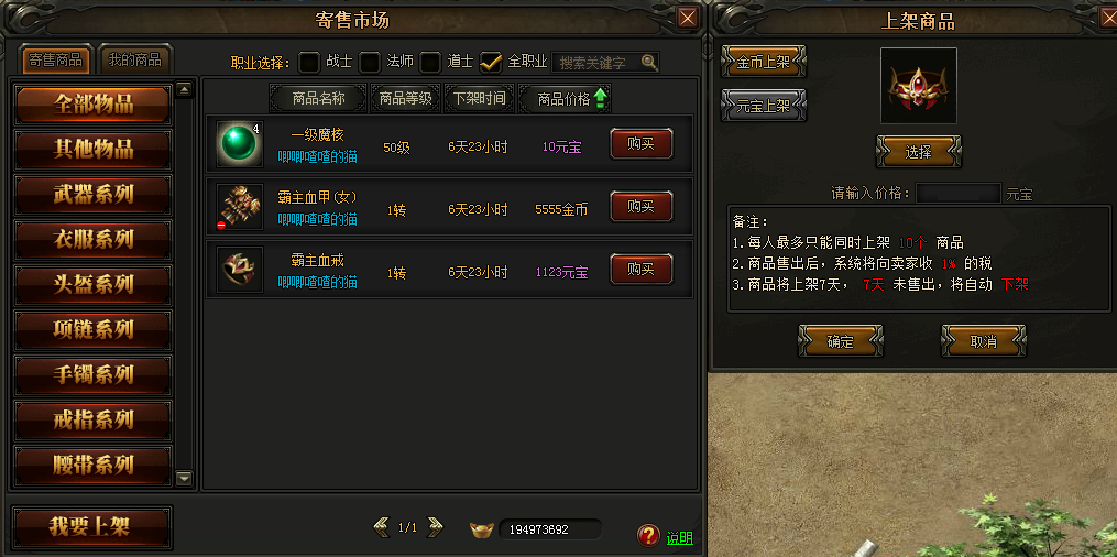 300游戏中玩家们可以在这里体验到全新的魔幻世界,带你在这里感受到酐畅淋漓的打斗体验。今天给玩家们带来的是散人传说中的寄售系统。那么这个寄售系统是用来干嘛的呢?相信很多玩家还不是很了解吧。那么接下来,小编就来简单的介绍一下散人传说中的寄售系统。游戏内赚元宝的途径就是出售装备,当玩家在游戏中获得多余的好装备时,可以在寄售商城内以元宝或者金币的形式出售,所获得的收入由系统以发放到玩家手里。这样比玩家交易的好处是这个是一口价的,不用担心遇到麻烦的讨价还价。入口: 开放等级:达到60级,可以使用寄售功能。寄售市场可出售装备与材料,点击“我要上架”从背包里选择物品出售,上架物品可以选择金币上架或者元宝上架;每人最多同时上架10个商品;商品售出后,系统将向卖家收取1%的税,不足1元宝按1元宝收取,上架7天未售出,物品将自动下架