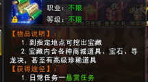 325《九天封神》是一款上古神话题材的动作角色扮演类网页游戏,游戏中玩家们可以在这里体验到不一样的仙侠世界。那么。你对游戏中的藏宝图了解吗?下面不妨与小编一起来看看。《九天封神》藏宝图 1.1获得途径 1.玩家在完成悬赏任务时,有几率获得藏宝图,第20环悬赏任务有几率获得高级藏宝图。2.高级藏宝图也可以通过3个寻龙诀合成获得。1.2藏宝图寻宝 1.使用后,可以查阅藏宝图的宝藏地点。 2.玩家达到所在地点后开始挖宝就可以挖出宝藏。3.宝藏可不是那么好挖的哦,需要对比小地图(快捷键M)才容易找到。1.3高级藏宝图寻宝 1.与普通藏宝图的寻宝方式一样,要到指定的地点挖宝,但挖出来的物品奖励更高。2.每次会挖出6叠物品,第1叠是免费获得的,如果看到价值很高的道具,就不要放过了。