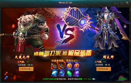 438九天封神是一款上古神话题材的动作角色扮演类网页游戏,游戏中玩家们可以在这里体验到不一样的游戏体验。游戏中神仙打架该怎么样玩?九天封神神仙打架有什么奖励?小编为大家带了九天封神神仙打架怎么样开启 九天封神神仙打架玩法攻略。《九天封神》神仙打架 1.1神仙打架 开服前7天,玩家达到40级即可参加神仙打架活动。游戏中强力boss将会定时定点进行互殴,玩家根据喜好选择助威的boss,拿钥匙。还能去场地围观boss之间强力的对战,并且用钥匙开启打架过程中掉落的宝箱。 1.2神仙打架怎么玩? 打开界面可以看到一蓝一红两方阵营的boss,玩家可以点击“给他助威”的按钮,给喜欢的boss加油打气。每半个小时可以助威一次,每次助威可以拿到对应阵营颜色的钥匙。Boss开始打架之后,会在根据各自的血量高低,在打架场地周围掉落对应阵营