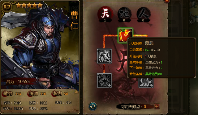 1016大皇帝是款非常好玩的策略国战页游,游戏中玩家们可以在这里感受到全新的攻城略地玩法,带你在这里开启全新的征战之旅。在《大皇帝》的世界中,主将的武将天赋加点十分重要,今天,小编这就给大家带来一个主将天赋加点攻略吧。70、80阶段,将开启更多的天赋点,在选择天赋时可以有更多的选择思路。我们仍然按照上篇的“三大类型”进行划分。<先手爆发>符合该类武将有:赵云、孙策、吕蒙、华雄,尤以赵云、孙策最为出色。<先手控制>符合该类武将有:吕布、马超、郭嘉,尤以吕布、郭嘉最为出色。<先手减免>符合该类武将有:夏侯惇、于禁、蔡文姬、曹仁。70级天赋:点法一(适合抢先手速度)地:10军略,10将才人:10学识点法二(适合肉盾)地:10军略,10兵备,5将才80级天赋:点法一(适合先手爆发)天:6勇武