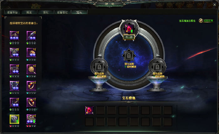 519龙神契约是款十分受大家青睐的页游。游戏中拥有众多职业与角色。游戏中宝石对大家至关重要,有了宝石玩家们可以合成更多武器装备。那么,你知道龙神契约宝石合成吗?龙神契约宝石合成怎么玩呢,今天小编就为小伙伴们带来了龙神契约宝石合成玩法攻略。宝石玩法,为装备位镶嵌不同的宝石,提升自身属性,不同种类的装备上只能镶嵌某种宝石。宝石分为武力(+30)、星术(+30)、灵御(+30)三种,分别对应人物潜能属性,可镶嵌在不同装备位上,同一装备上可镶嵌三个宝石。随着装备等级的提升,宝石孔会增加,升级装备不会影响宝石,但是宝石有固定的镶嵌位置。特殊宝石除外,它可以镶嵌在任意的宝石孔上。宝石可通过上古皇陵、天空之城和国家任务获取,大多都是一级的宝石。一级的宝石也可以通过合成升到高级的宝石,5颗级同类型同等级宝石合成为下一级同类型宝石。在