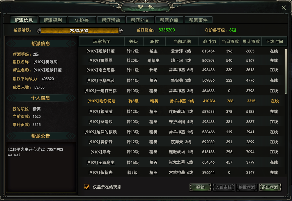 792龙神契约帮派系统来了,当玩家们在玩龙神契约的时候达到一定等级了,为了更好的发展,往往会选择一个帮派加入,在帮派当中寻找一群能够玩得来的玩家,在帮派当中除了有这个好处之外还会其他的一些关于帮派的玩法,为了让大家更好的了解帮派系统,今天小编就为小伙伴们带来了龙神契约帮派系统玩法攻略。 帮派玩法,玩家可创建或加入帮派,合众人之力一起建设帮派,共同参与帮派活动获得大量奖励。帮派任务:消耗帮派贡献可接取帮派悬赏任务,完成后可获得奖励。帮派商店:消耗帮贡可兑换其他功能的强化道具。帮派转盘:消耗帮贡进行抽奖,奖励为人物属性。守护神玩法,帮派成员齐心喂养守护神,守护神可为全体帮派成员带来属性加成,等阶越高,加成越多。帮派成员每周可挑战已拥有的神兽一次,奖励丰厚。 王城争夺:与其他帮派对王城进行争夺,获胜方将成为王城的占领者,下