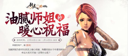 02017圣诞节,就来《剑灵洪门崛起》收下满满好礼吧!无论是新老玩家,油腻师姐都精心准备了暖心祝福。2017圣诞节,就来《剑灵洪门崛起》收下满满好礼吧!无论是新老玩家,油腻师姐都精心准备了暖心祝福。老玩家回归有特权,超级BUFF、专属VIP祝福伴你回归;新玩家登录有礼,海量奖励欢喜跨年;玩家完成相应任务还可获得抽奖机会,游戏元宝、2倍塔防券等众多游戏道具免费抽取。除此之外,师姐还将随机抽取幸运玩家送上充值感恩BUFF,直接返利Q币壕给力。 油腻师姐的暖心祝福 老玩家回归:尊享超级BUFF、专属VIP祝福感恩有你,曾经相守,年底了,师父喊你回洪门!活动期间,只要满足老玩家回归条件的,即有创建角色,但从2017年12月11日起没有再登录过《剑灵洪门崛起》的QQ账号,进入2017年12月25日后创建的新服,就会被认