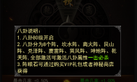 0前一个八卦阵满十级放开激活下一个八卦阵,8个阵全部激活可以获得一击必杀属性;激活和升级八卦阵需要消耗阵眼石,阵眼石可通过VIP礼包和神秘商店获取。更新时间:2019.03.29 早上9:30-10:30新增系统:八卦开启条件:开服三天后,入口位于兵魂;优化内容1. 修复帮派成员面板战力显示为负的问题2. 修复兵魂15阶后不能升级的问题3. 调整VIP礼包奖励