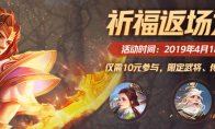 0祈福返场大狂欢 一、开启祈福 2019-04-18 10:00:00——2019-04-28 23:59:59 游戏主界面左上角,点击“祈福”按钮,进入祈福主界面。 点击祈福一次,将开启一个祈福灯(若无祈福灯,则弹出购买界面,1000元宝/个),必得1点祈福积分,并获得祈福奖励。 点击祈福十次,将连续开启十个祈福灯,必得10点祈福积分,并必得【凤鸣冠】6至10个。 每次祈福必得1点祈福积分,并且按照以下概率获得道具:道具 概率 重复返还 曹婴0.01%枭雄金印*1 徐荣0.01%枭雄金印*1 司马徽0.02%枭雄金印*1 陈琳0.03%枭雄金印*1 孙皓0.03%枭雄金印*1 普通武将15.00%中郎将印*1 传说皮肤1.90%史诗皮肤5.00%稀有皮肤8.00%普通皮肤10.00%三国秀10