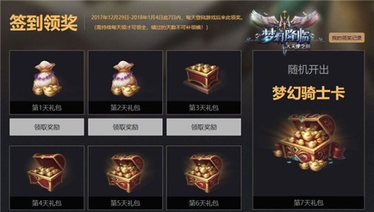 0每逢佳节倍思亲,在众多网游中,只有《大天使之剑》跟你最亲,借着节日的到来,游戏在推出新职业的同时,还举办了福利活动让大家参与,各种豪礼纷至沓来,你还想在元旦的时候外出旅游体验人山人海的拥挤吗?不如来参加活动领取丰厚的奖励吧。《大天使之剑》的签到福利活动已于今日正式上线,在2017年12月29日-2018年1月4日此7日内,玩家只需要每天登陆游戏后坚持签到,即可领奖,错过的天数不可补领哦!在领奖的过程,还有机会随机开出梦幻骑士卡,将新职业带回家。 除了上述,《大天使之剑》还有其他可获得梦幻骑士卡的办法,玩家可在活动页面点击【获取途径】按钮,在第一条途径参与本专题“预约活动”的右边点击预约,填写手机预约成功后,在梦幻骑士2018年1月3日上线当天,预约礼包码将通过您填写的预约手机短信发放,所以一定要填写自己的手机哦